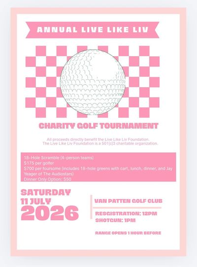 We are excited to announce that registration is officially available for the Live Like Liv Charity Golf Tournament hosted by the Live Like Liv Foundation! Join us for a meaningful day on the course honoring Liv’s legacy of strength, hope, and kindness, all while supporting families navigating pediatric cancer. This event brings together community, compassion, and purpose, and we would love to see you there.